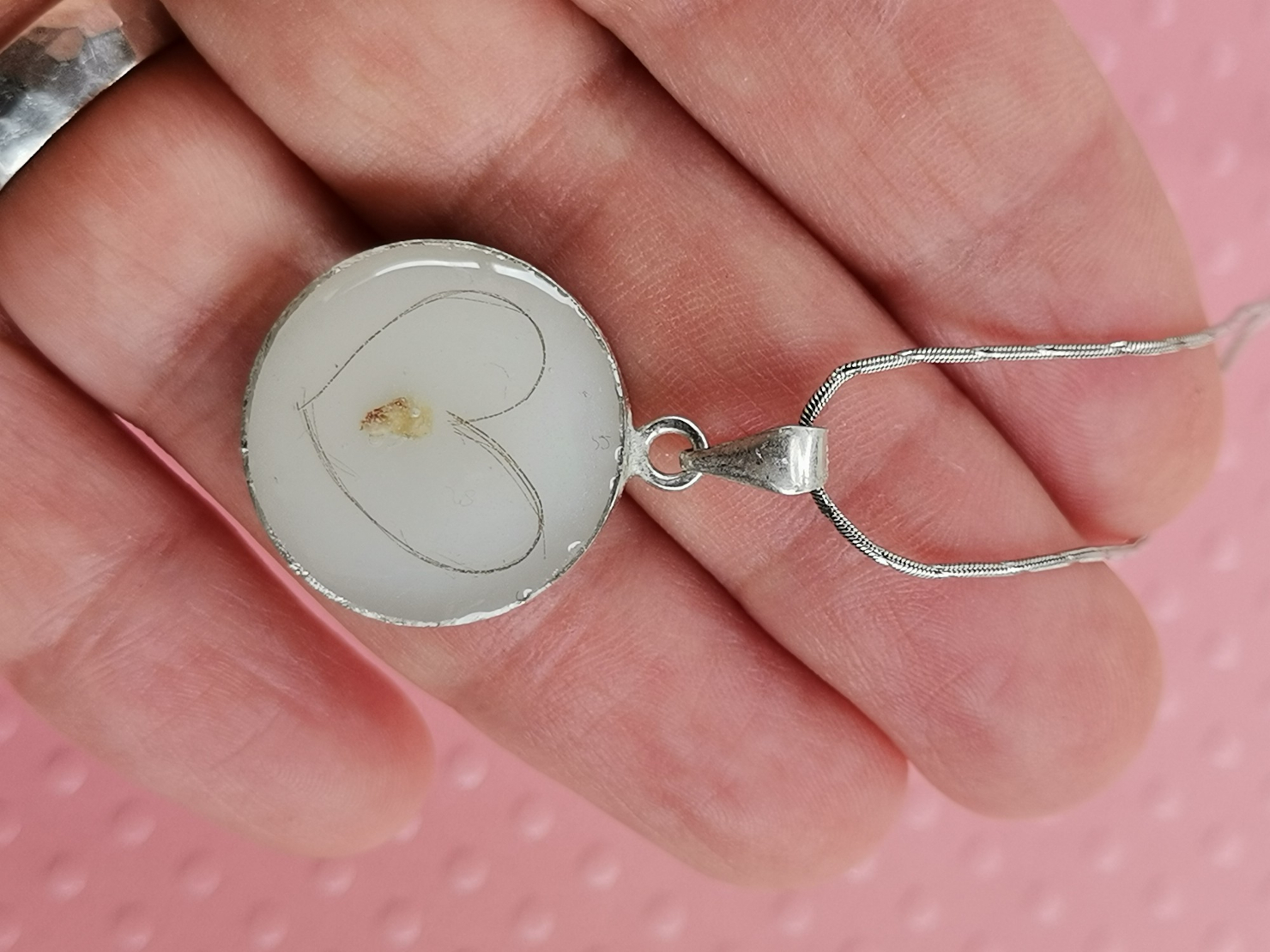 Unutrašnjost priveska ispunjena je majčinim mlekom, trajno sačuvanim u formi dragocene uspomene. Po želji, u privezak je moguće ugraditi dodatne lične elemente. To može biti pramen kose, deo pupčanika ili razni dekorativni detalji, čime svaki komad postaje potpuno jedinstven.